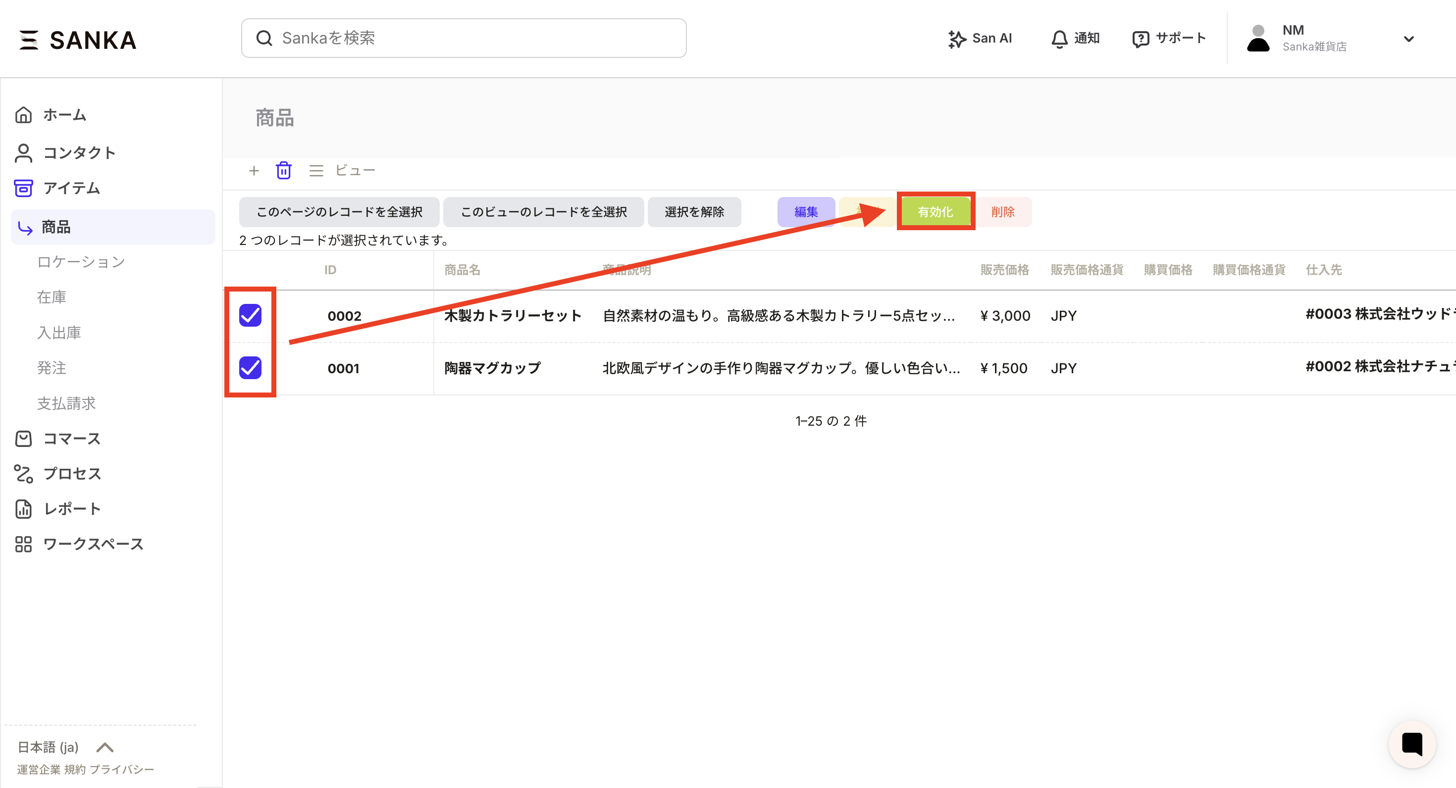 ③アーカイブしたレコード一覧から元に戻したいレコードのチェックボックスをクリックし、「有効化」ボタンを選択します。通常のビューにレコード情報が戻ります。