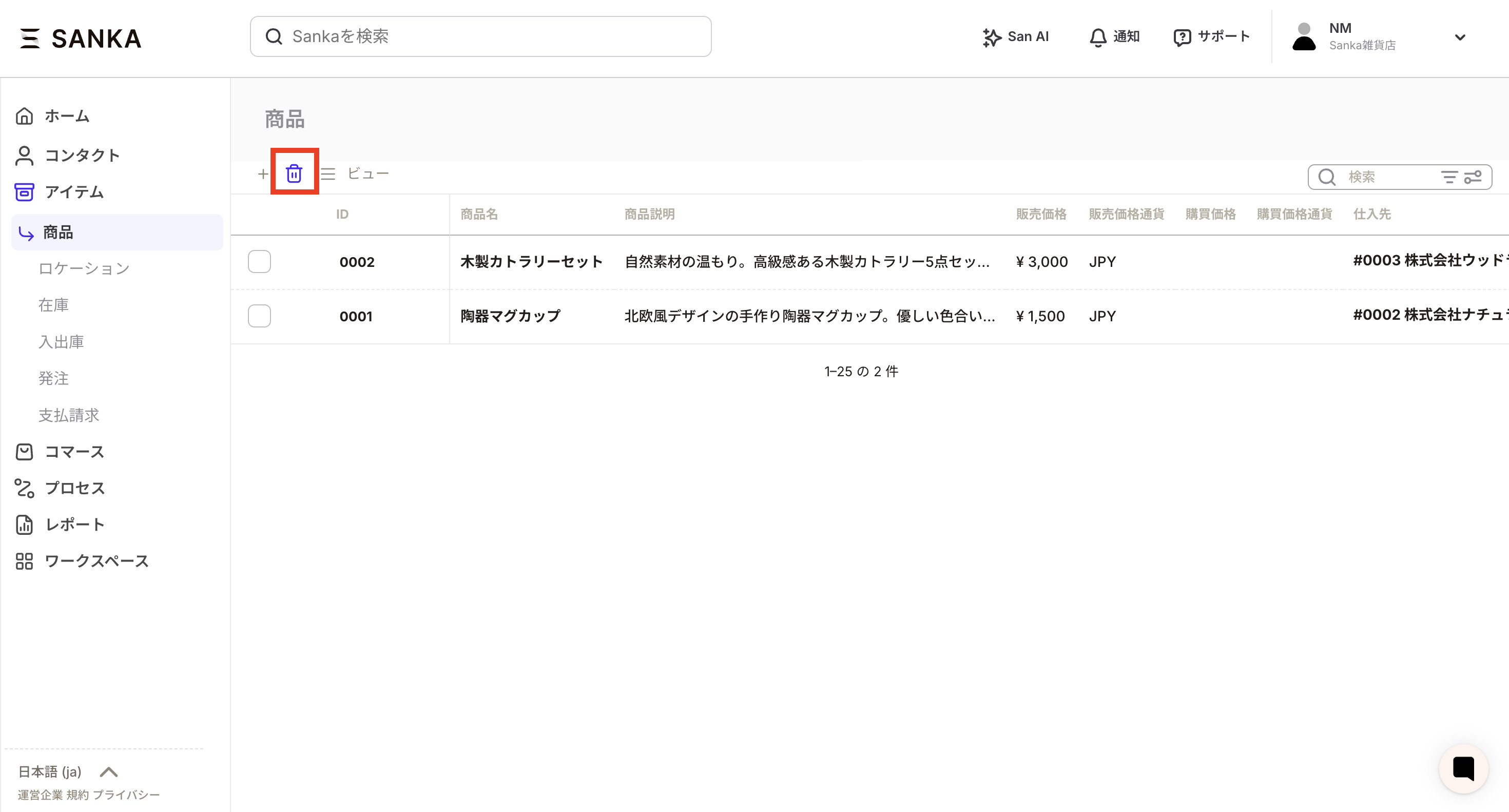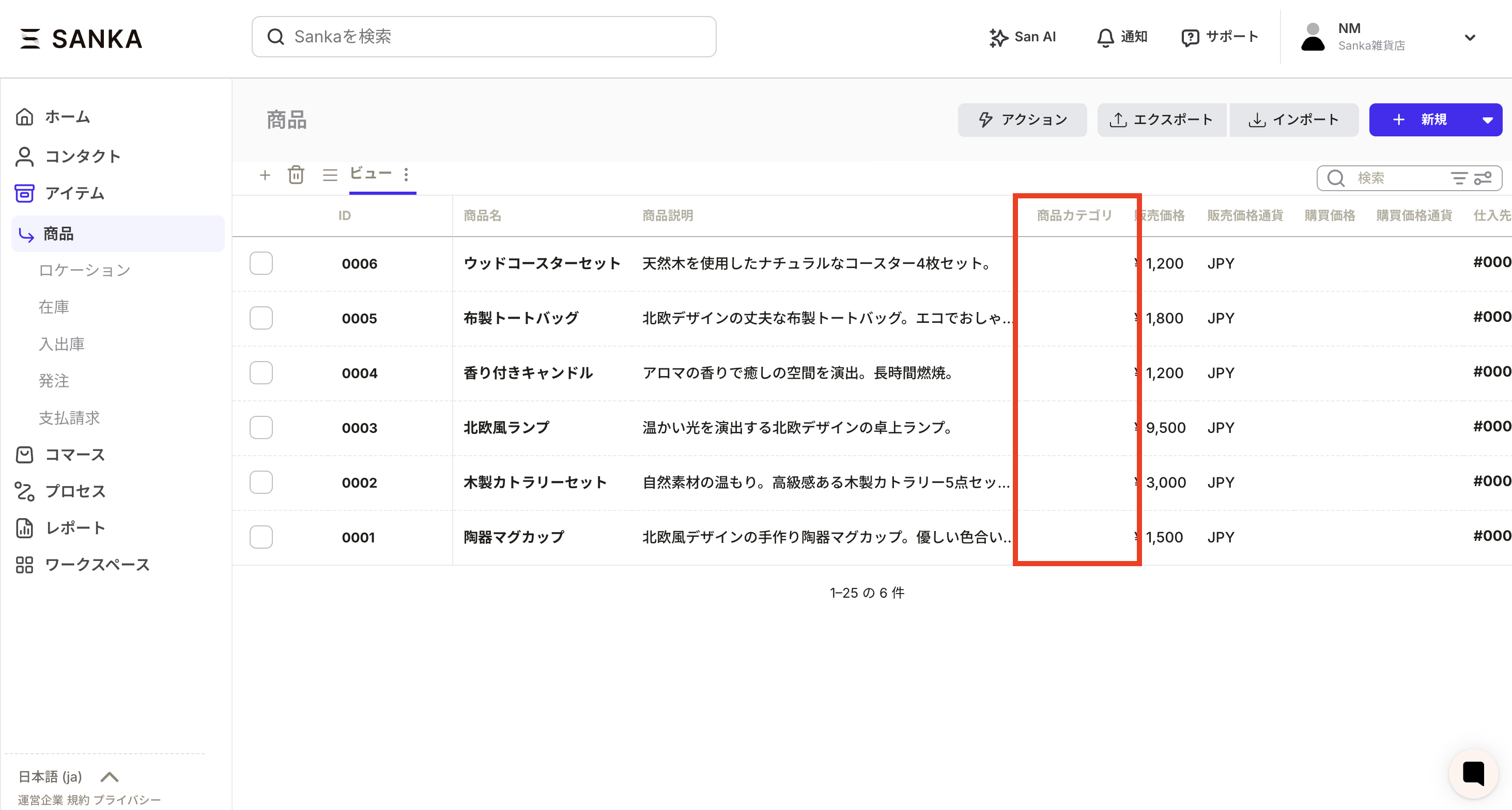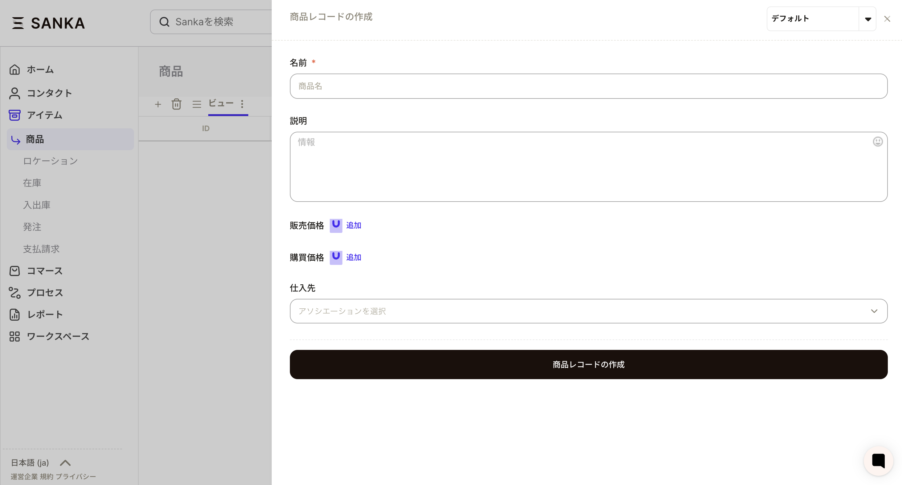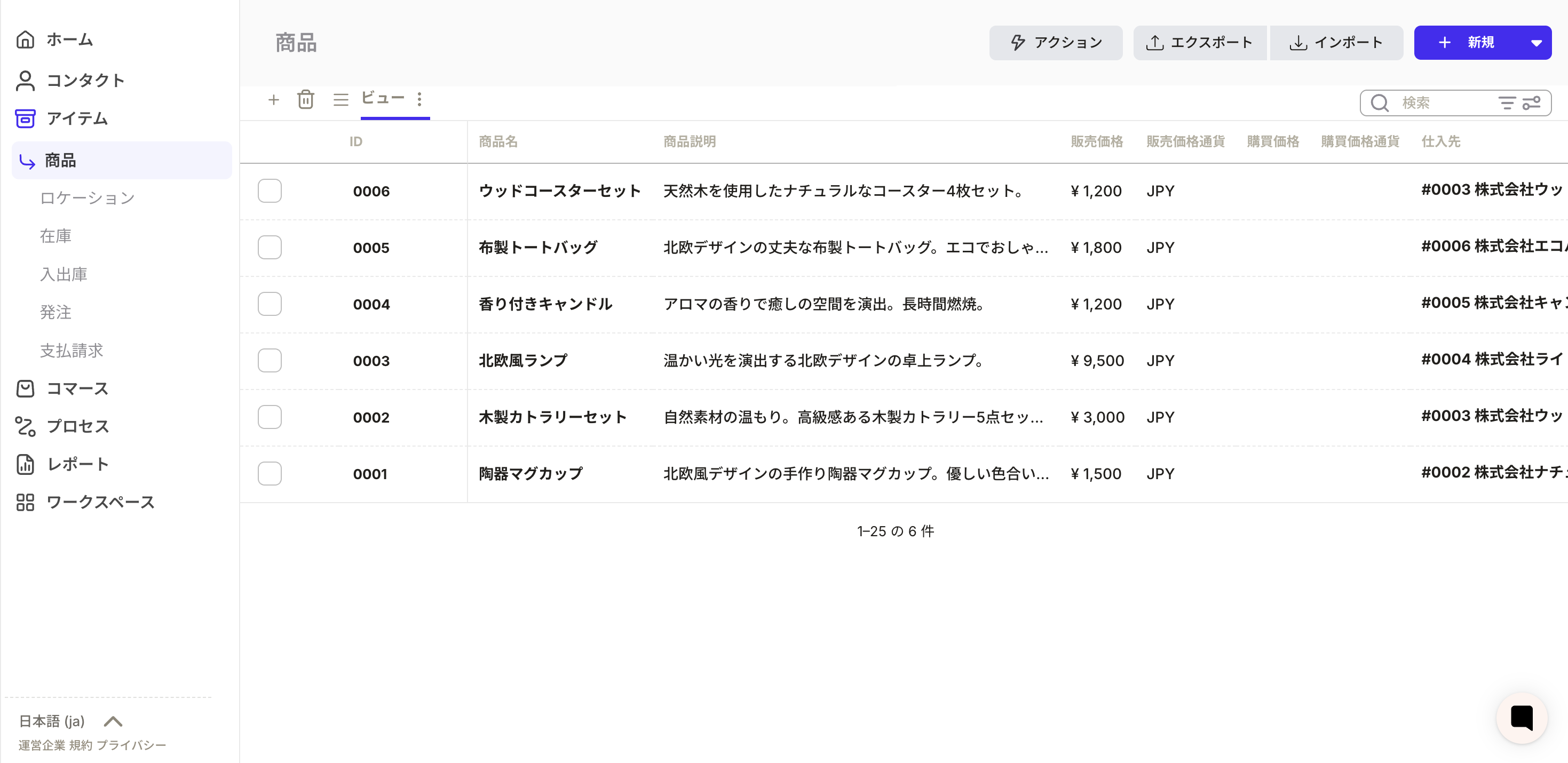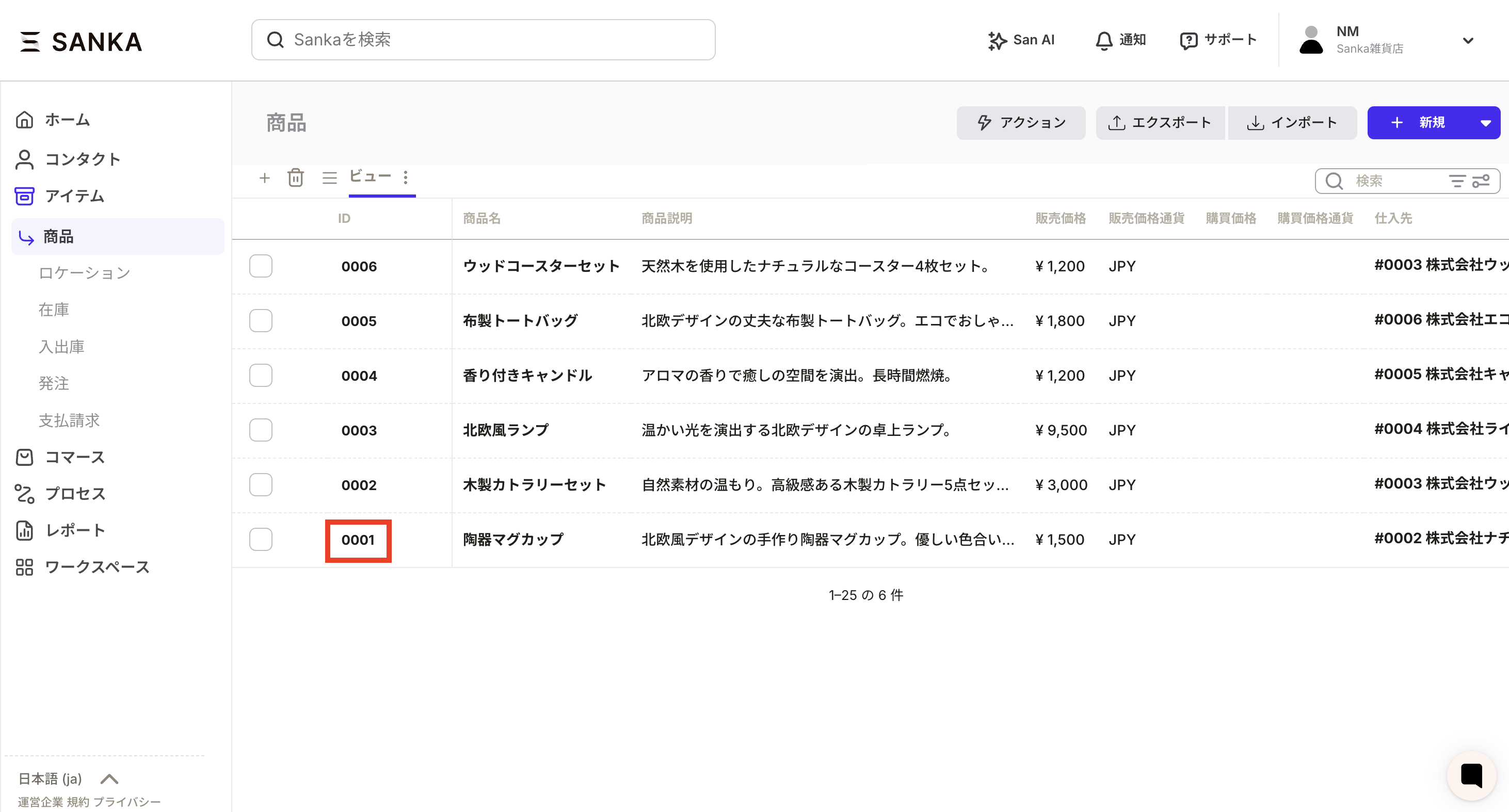 商品ID: 各製品に割り当てられる一意のID。自動採番されます。また、商品IDから在庫や、注文、発注など、紐付いている他のオブジェクトレコードを参照することができます。