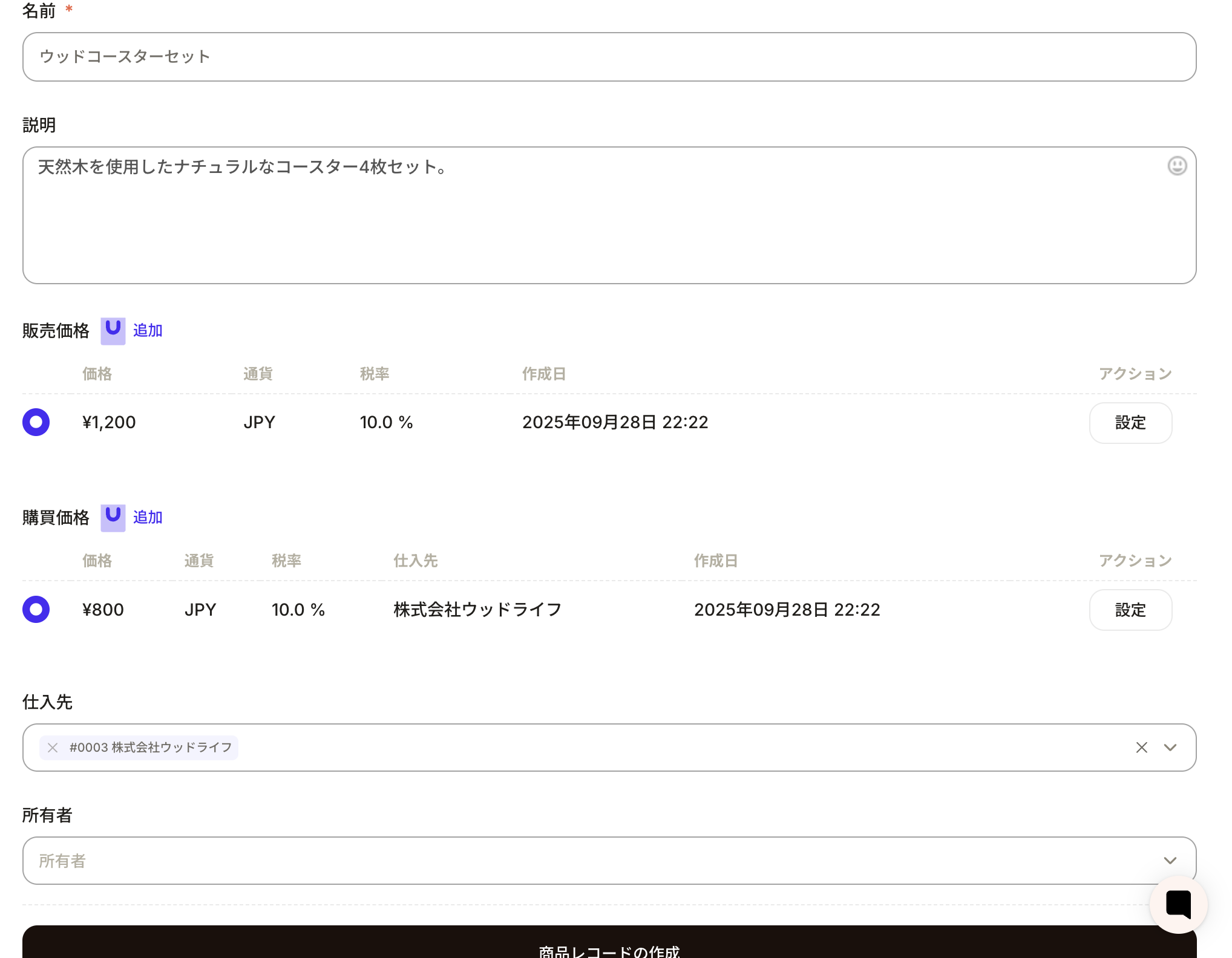 必要事項をいれたら「商品レコードの作成」をクリックします。