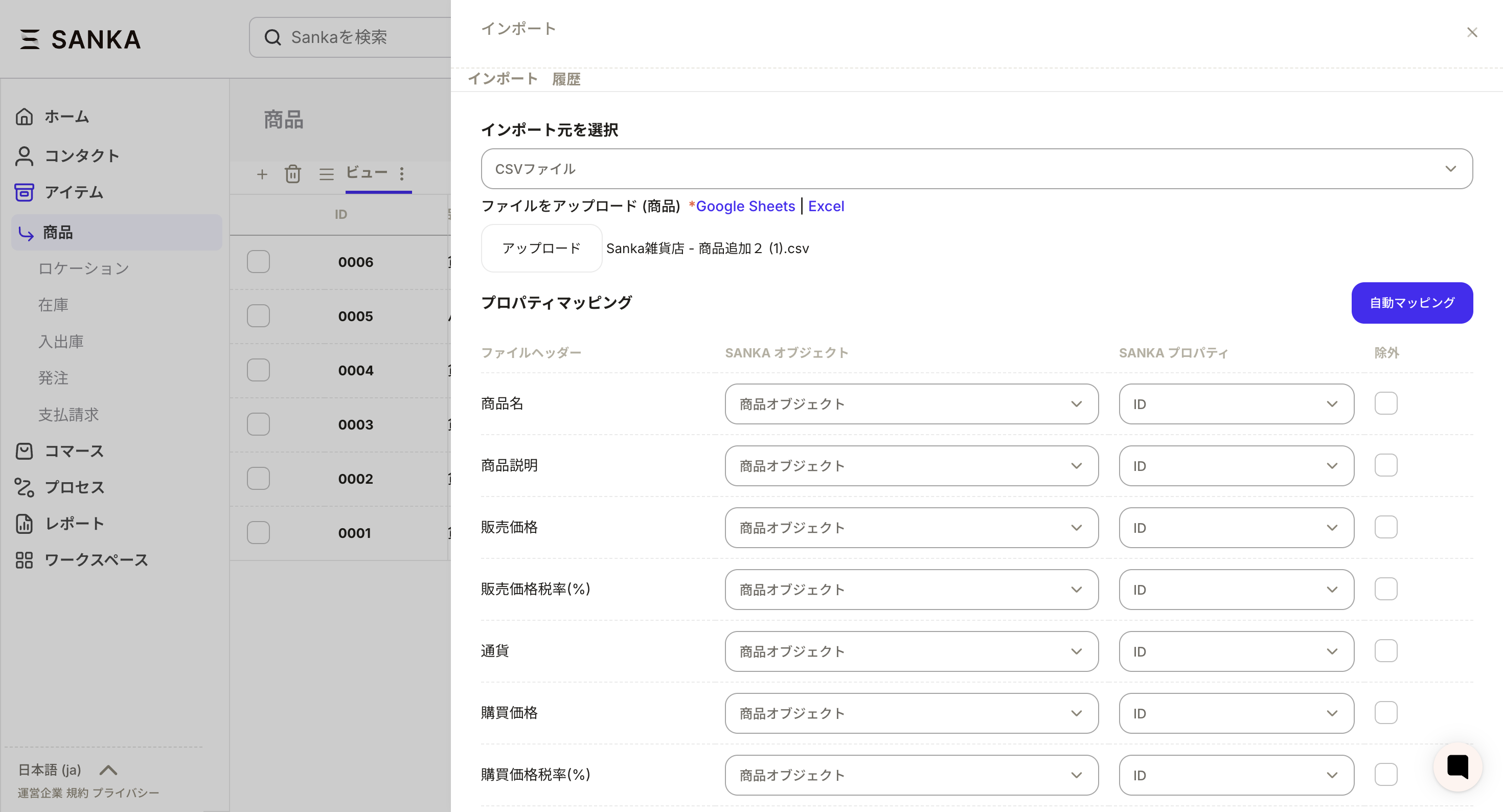 このマッピングでは、CSVファイルヘッダーがSANKAプロパティのどれにあたるかを設定します。 SANKAオブジェクトは「商品オブジェクト」のままにしておきます。