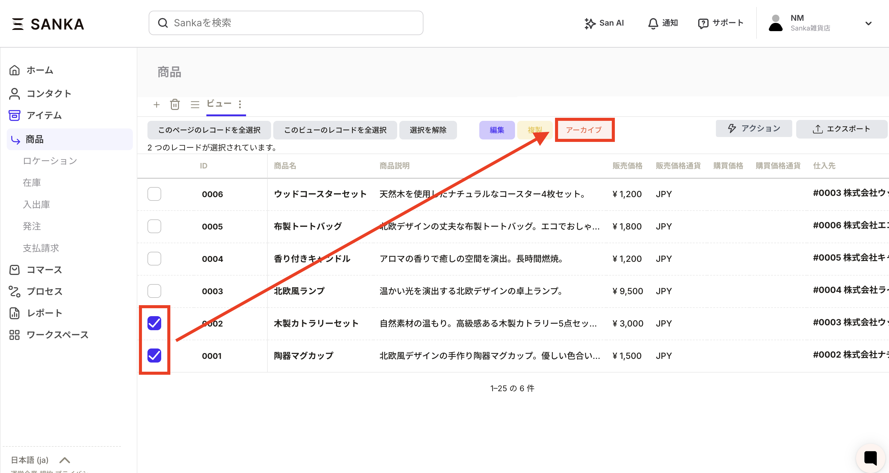 ①アーカイブしたい商品のチェックボックスをクリックし、「アーカイブ」を選択します。