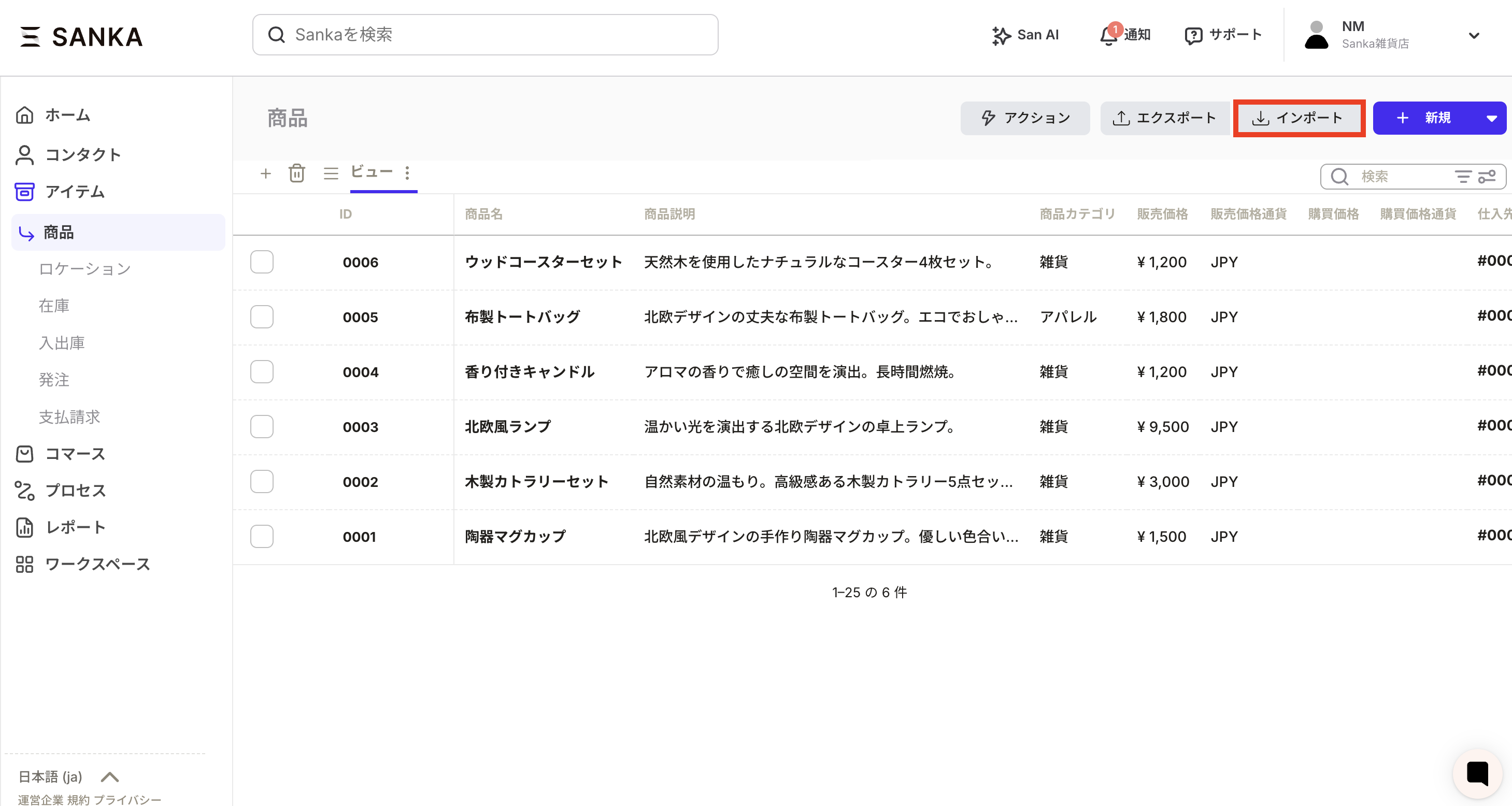 ①「商品」オブジェクトレコード画面一覧の右上の「インポート」ボタンをクリックします。
