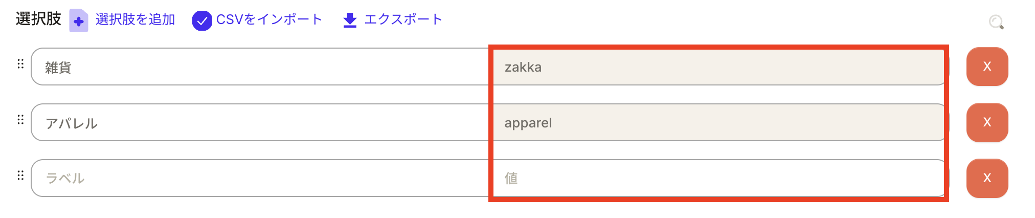 ※選択肢やステータスのプロパティを追加する場合はラベル名ではなく値名を入れる必要があります。
