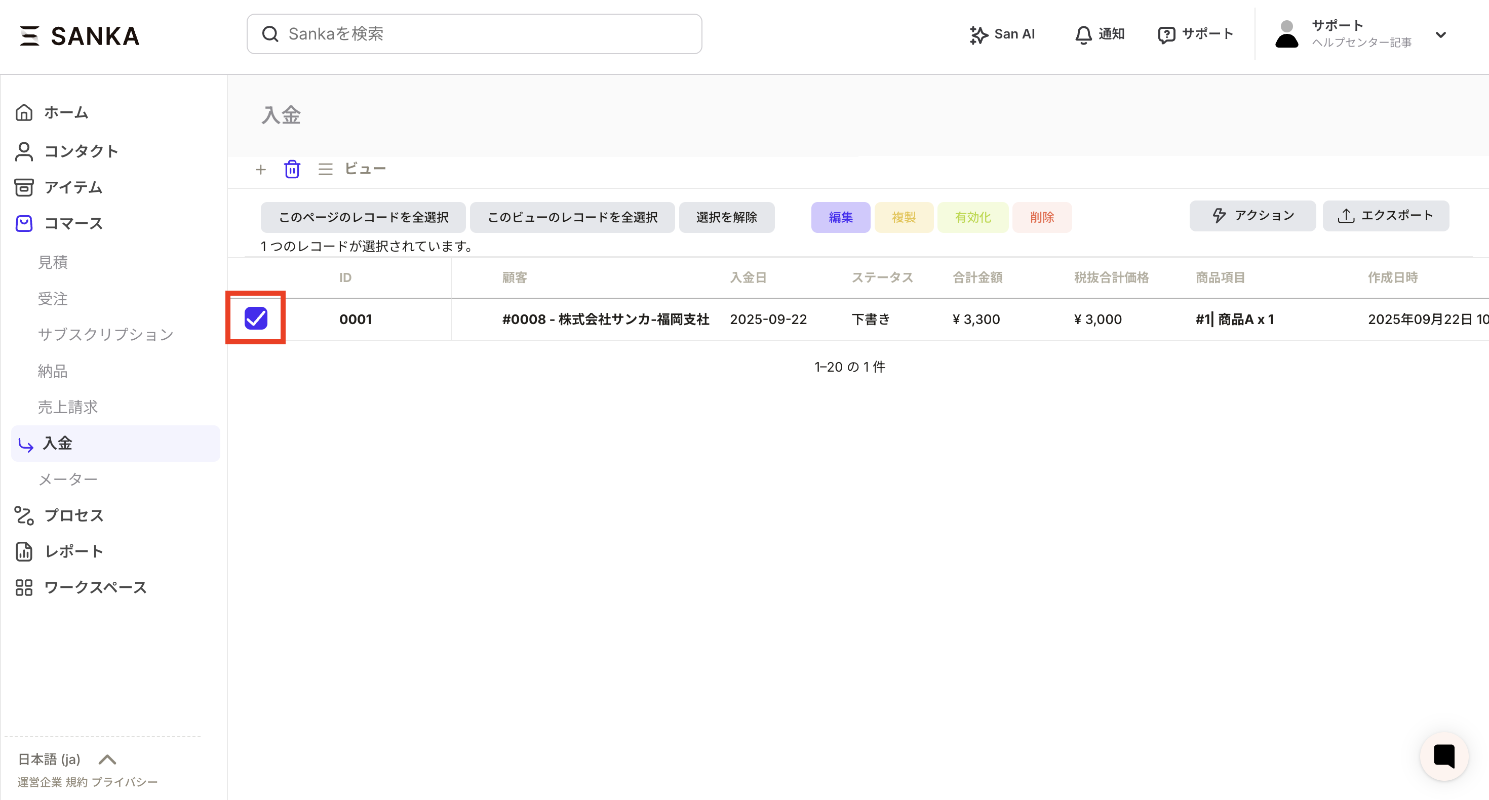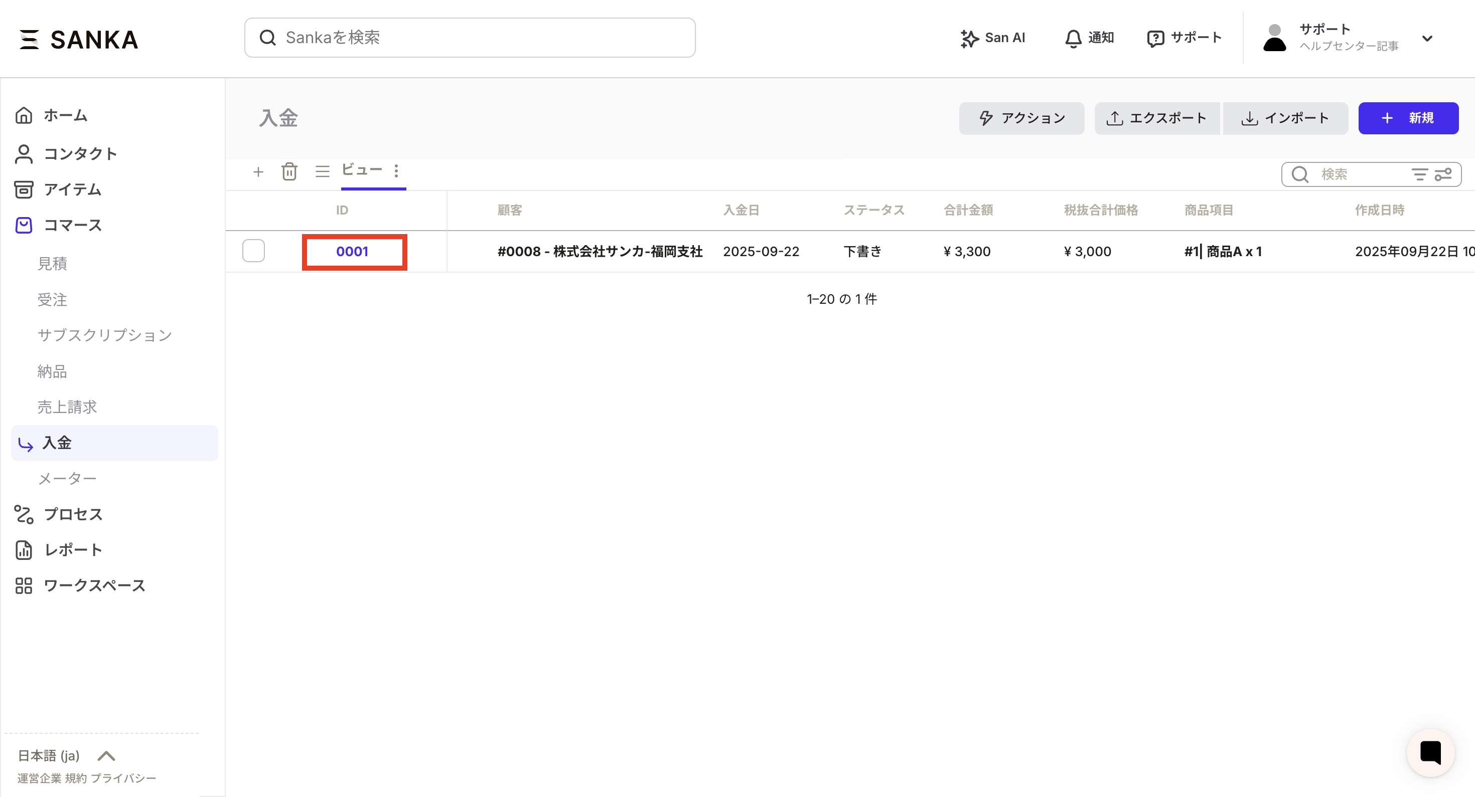 Sankaでは入金レコードごとに固有のIDが付与され、商品や取引先などの必要な情報と連携させることが可能です。