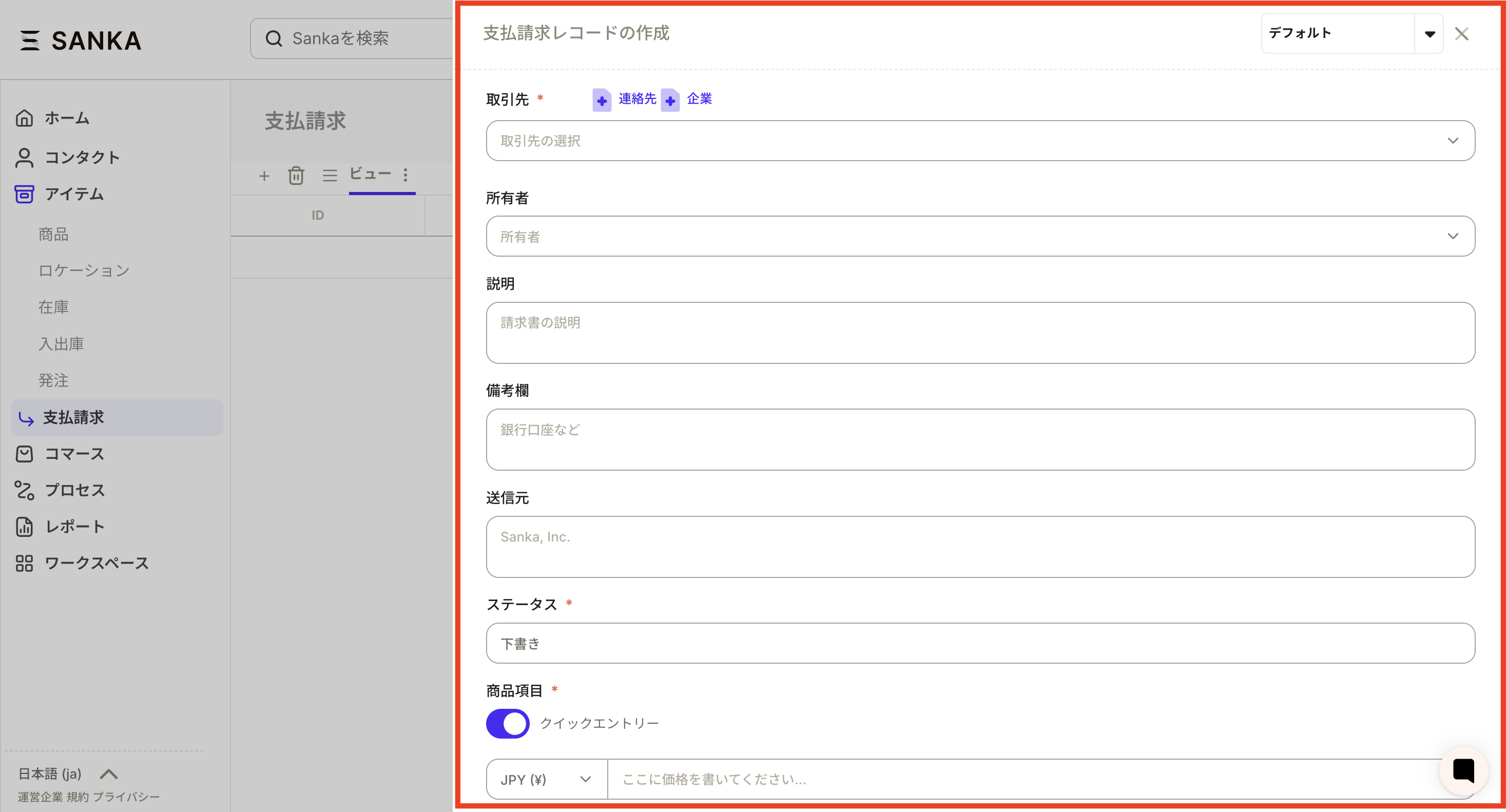 ②「支払請求レコードの作成」画面が表示されます。必要な情報を入力していきましょう。