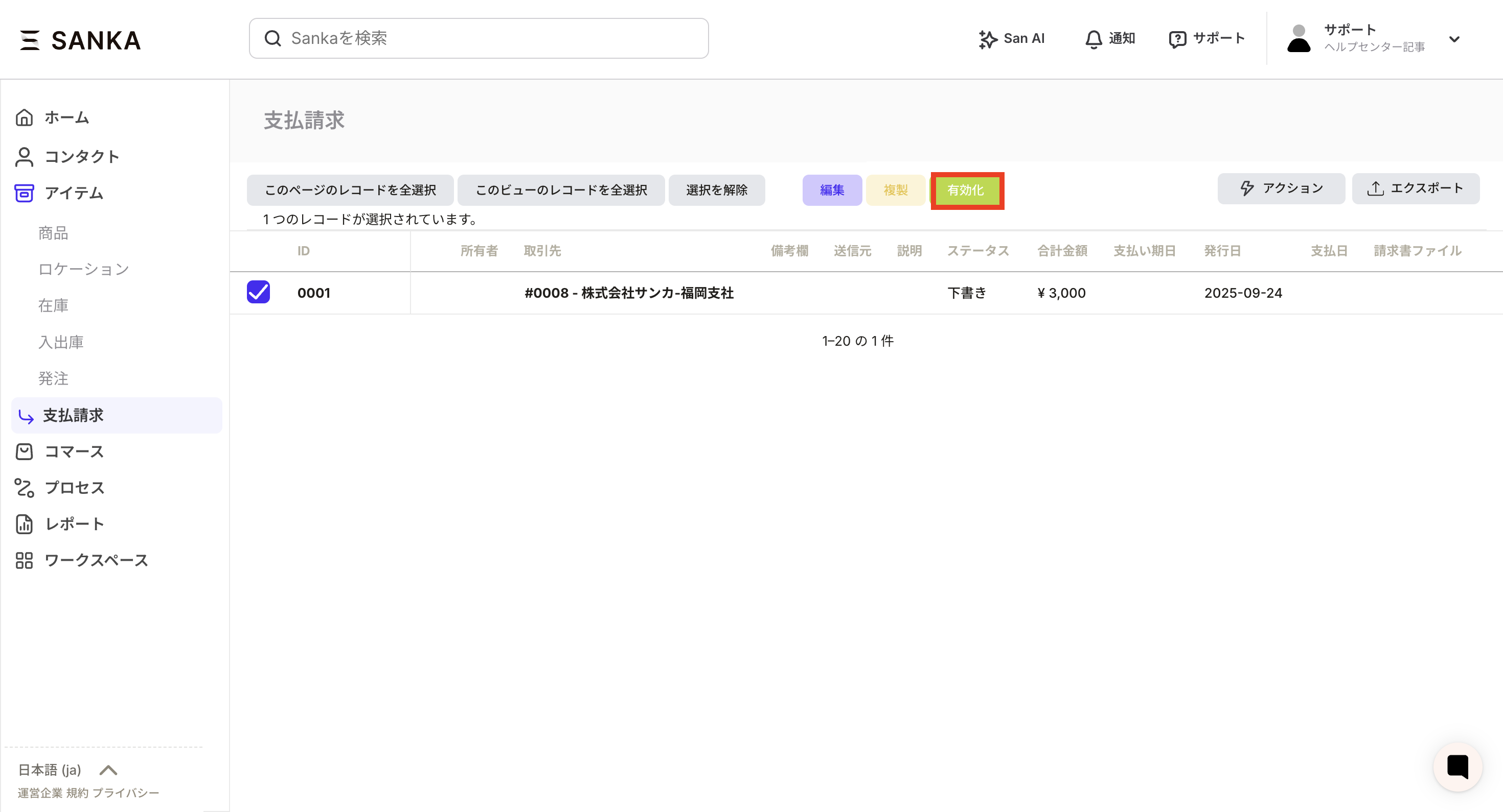 ④いままでアーカイブされたレコード一覧が表示されます。該当するレコードのチェックボックスをクリックし、有効化ボタンを押します。 ※現在、支払請求オブジェクトではレコードの削除はできないようです。