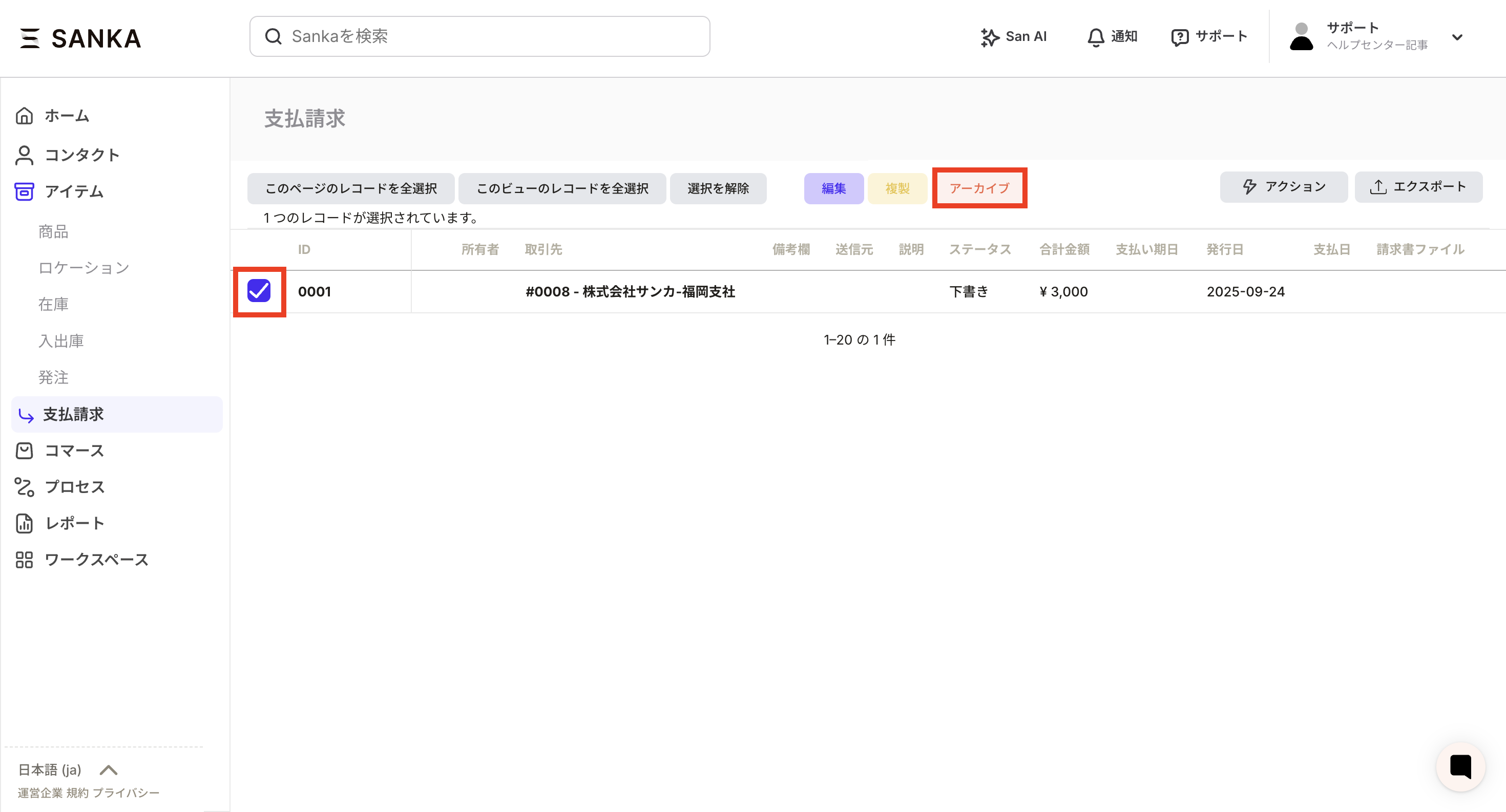 ①アーカイブしたいレコードのチェックボックスをクリックし、「アーカイブ」を選択します。