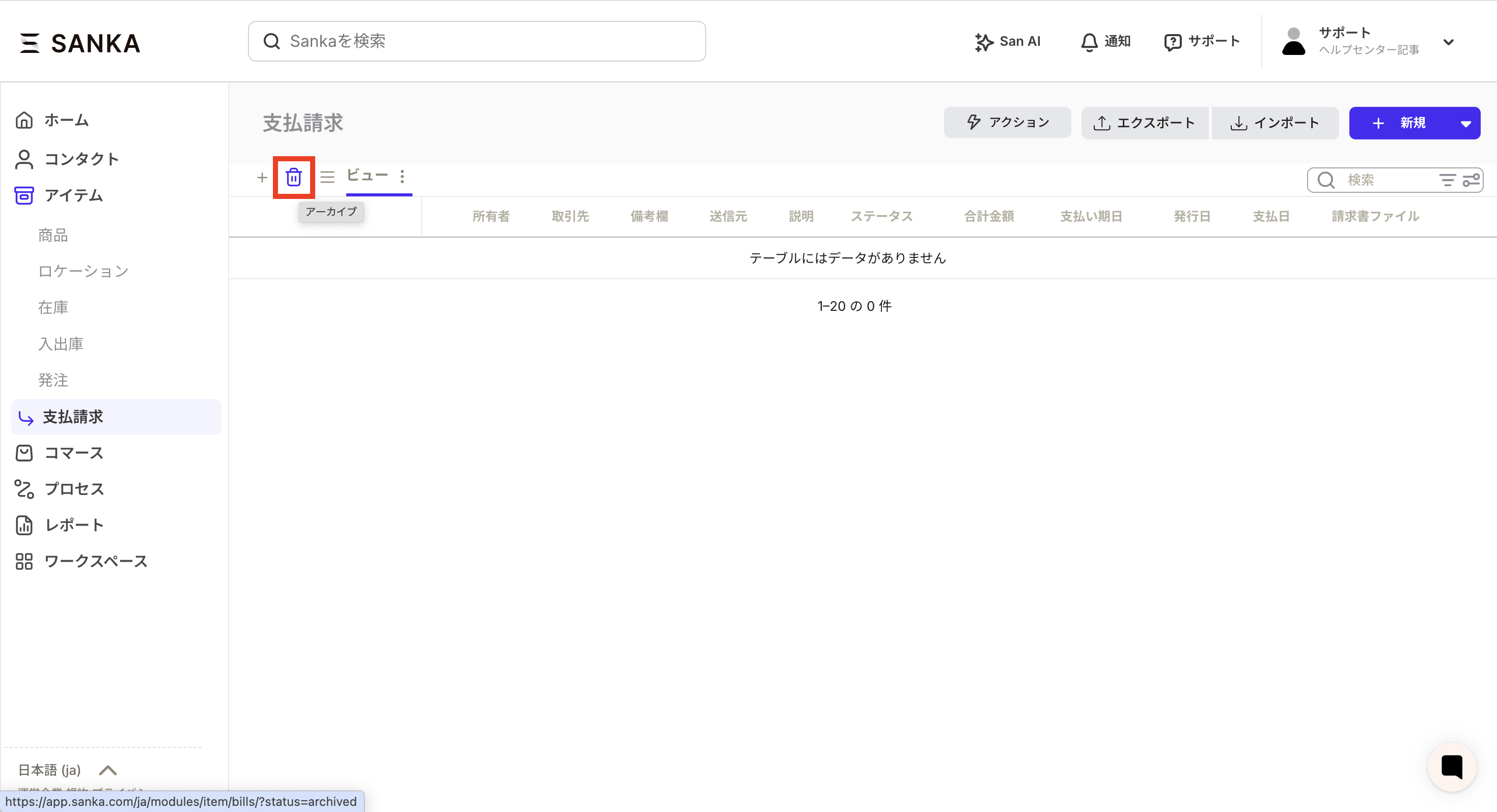 ③アーカイブを解除したい場合は、レコード一覧左上にあるゴミ箱マークの表示設定に行きます。