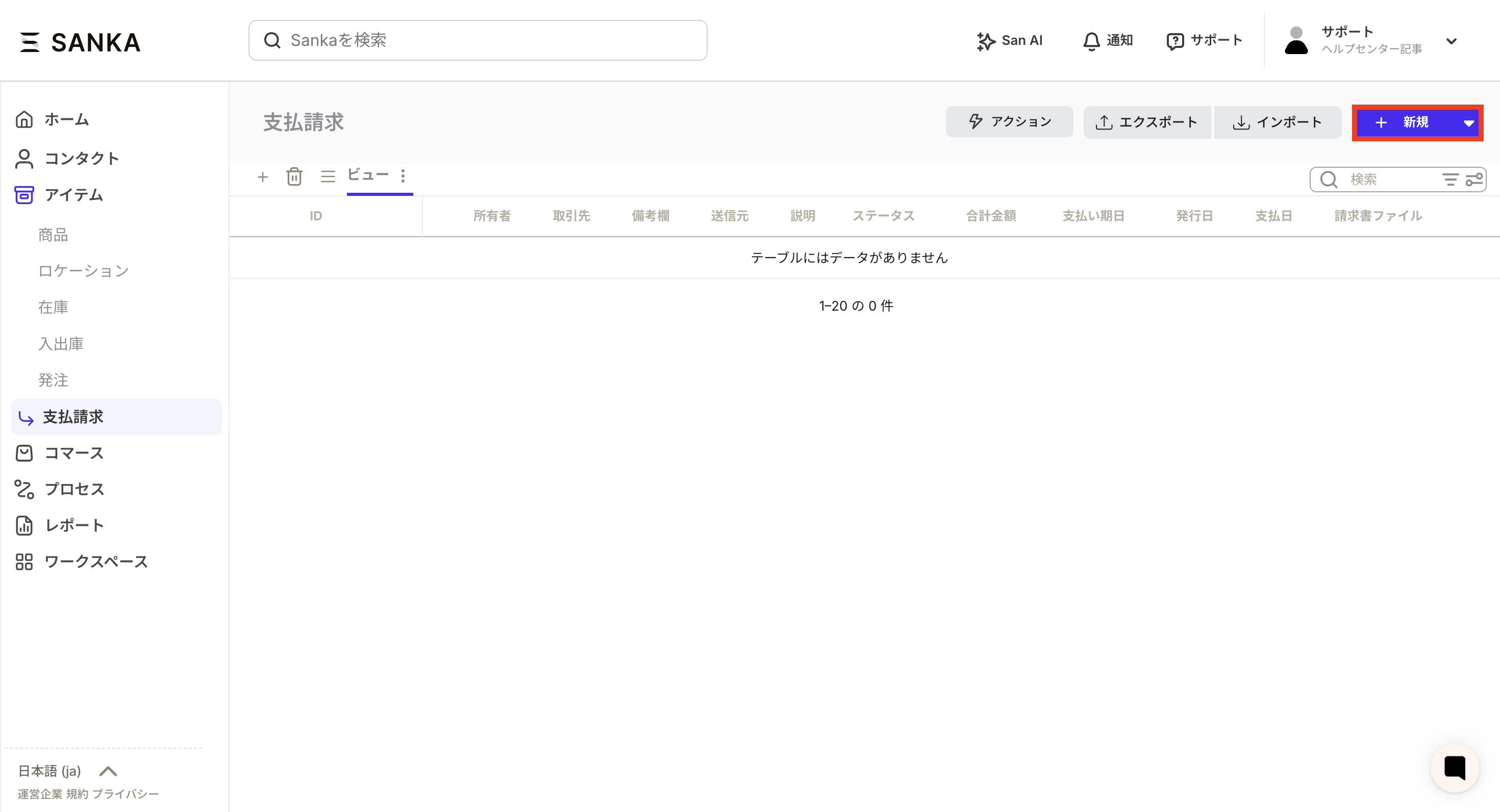 ①請求書オブジェクトに移動し、画面右上の新規作成を選択します。